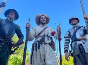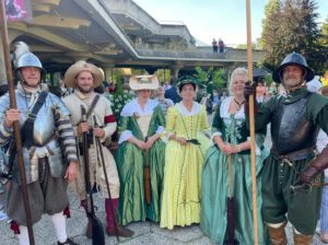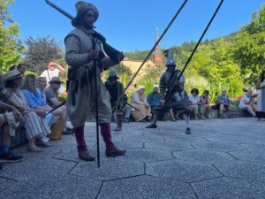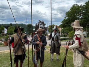 Am vergangenen Wochenende waren wir mit einer kleinen Delegation zu Gast in Badenweiler. Der schöne Kurort im Markgräflerland am Rande des Schwarzwaldes feierte sein 1950-jähriges Bestehen mit einem Streifzug durch die Geschichte des Ortes, wobei wir die Zeit des Dreißigjährigen Krieges darstellten. Badenweiler erlebte während des gesamten Krieges, besonders aber ab den 1630er Jahren, zahlreiche Einquartierungen, Durchzüge und Plünderungen durch die verschiedenen Kriegsparteien. Unsere Soldaten und Marketenderinnen zeigten den überaus interessierten Besuchenden den militärischen Alltag, den Drill der Musketiere und Pikeniere sowie verschiedene handwerkliche Tätigkeiten.